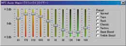 また、MP3再生時に音符のアイコンをクリックすると、10バンドのグラフィックイコライザーが表示される。ポップス、テクノなど6種類のプリセットも用意されていて、とても使いやすい。パソコン用アンプ内蔵スピーカーで聴いている場合など、低音が物足りないと感じるときは、60Hzから310Hzまでの帯