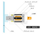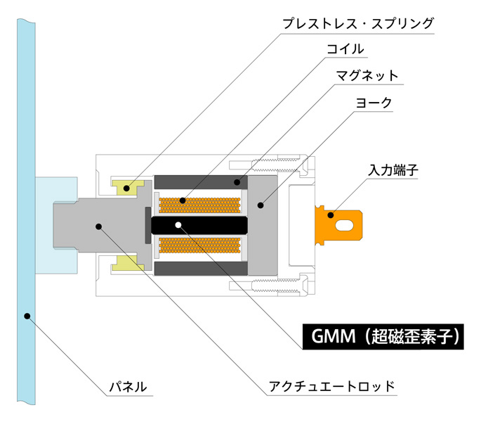 GMM素子は、フェライト・マグネットと同様、原料を粉末状として焼成する粉末冶金法で、種々の形状が製造可能となる。今回開発された素子は400kgf/cm2(1平方センチあたり400kg)という強力なパワーを持っており、また、1nsec(10億分の1秒)の超高速で変位する、という高速応答性も備えている。 GMMエキサイタは、外寸が3mmφ×16mmという円柱状の約1gのGMM素子を中心に置き、その外側に4Ωのコイルを、更に外側にはRECマグネットを配した構造で、駆動素子の一端にプレストレス・スプリングで支持されたアクチュエート・ロッドを介し、発音体を駆動する形態である。 |