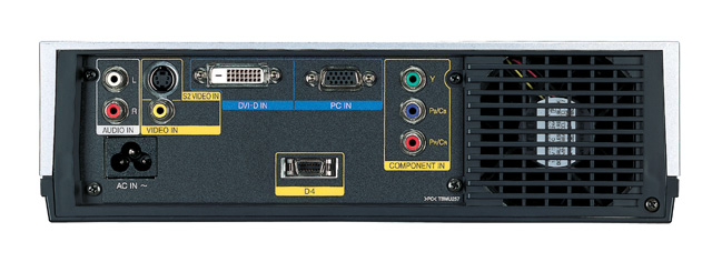 TH-AE300の背面端子部。PCとの接続用にDVI-D端子とD-SUB15ピン端子をそれぞれ備える。コンポーネントはRCA色差とD4端子を装備する(画像はクリックで拡大) |