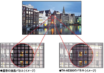 表示デバイスとして、TH-AE200はAE100と同じ解像度858×484画素のワイドパネルを採用した。特に525pとの親和性が高いワイドVGAである。TH-AE300は、新開発の960×540画素のワイドパネルを搭載し、さらなる高解像度を実現したのが注目される。また、AE300には、水晶の複屈折技術を応用し、見かけ上、画面に画素を隙間無く配置する新技術「SmoothScreen」が採用された(下の図を参照)。画素間の黒いラインを低減し、滑らかな質感を実現することにも成功している。