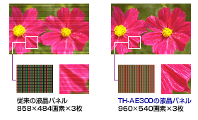 | TH-AE300は960×540の高解像度パネルを装備。縦横をそれぞれ2倍すればハイビジョンの解像度になり、高画質で画素変換が行える(写真はクリックで拡大) |