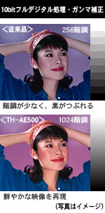 内容を掘り下げていこう。「シネマワークス」のポイントは大きく4点。TH-AE300比で4倍に階調の精度をアップした「デジタルガンマ補正」、「プロジェクターAI」「DSC」、それに「デジタルシネマリアリティ」である。まずガンマ補正が入/出力とも10ビットのフルになった。TH-AE300ではせっかく出口の方が10ビットでも入力が8ビットゆえ、階調は256止りであった。それが1024ステップとなり、よりキメ細やかな階調表現が可能。色数にして10億7000万色ものテクスチャーが出せるということだ。