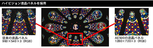 まず地上デジタル放送など、ハイビジョン環境が整いつつある状況にあわせ、新たに1280×720ドットのハイビジョン液晶パネルを搭載した。チップサイズは0.7インチのエプソン製だ。これはTH-AE300のハーフHDと呼ぶ960×540ドットのものよりもほぼ2倍近い精細度である。光学エンジンも当然これにあわせて性能を高めた。ランプパワーをあげ高輝度高コントラスト化を計っているが、数字で示せば800対1から一気に1300対1へ。1.6倍のコントラストアップということだから、これは大きい。