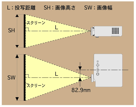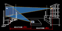 | TH-AE700の2倍ズームレンズを利用すれば、大小さまざまな空間で100インチの大画面を容易に得られる。さらに、上下、左右のレンズシフト機能を使えば、高さ方向では上下にそれぞれ78cmまであおりが効き、水平方向では左右にそれぞれ55cmまで本体の移動が可能だ。これまで障害があって大画面投写をあきらめていたユーザーは、図を参考にシミュレートしてほしい |