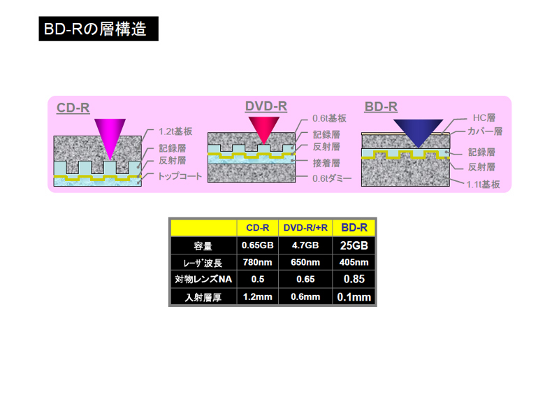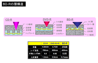 | ▲BD-RとCD-R、DVD-Rとの層構造の比較した図。BD-Rは厚さ1.1mmの基板上に記録層を設け,0.1mmの透明なカバー層で覆う構造が採用されている。波長405nmの青色(青紫色)レーザーと、開口数0.85の対物レンズにより、DVDの約5倍となる25GBの記録容量を実現している。(図はクリックで拡大します) |