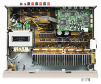 さらに、新しい06系では、グランド電位を安定化させ、一段と音質改善の効果を引き出す工夫が見られる。パワーアンプの電源ケミコンの裏側に銅製バスプレートを貼り、ブロックケミコンのリード、トランスのセンタータップ、スピーカーのグランドがプリント基板のパターンを経由せず、直結するようにした。グランドのインピーダンスを下げ、閉ループ化、電流が所定の位置に回帰する設計である。DSP関連回路とHDMI関連回路は、1枚の4層基板に集約して、高周波電流は距離を最短化した上でなるべく内層部を経由させ不要輻射を軽減させている。