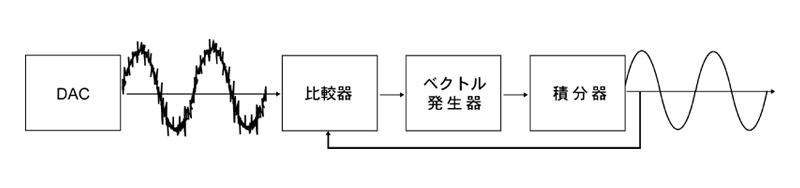 | 本機の内部構造。グラウンドの安定化と電流の正確な回帰が従来機種からの大きな改善点 | 「比較器」「ベクトル発生器」「積分器」を組み合わせた特許技術回路VLSCにより、アナログ変換後の音声信号に残留するパルス性デジタルノイズを排除 |