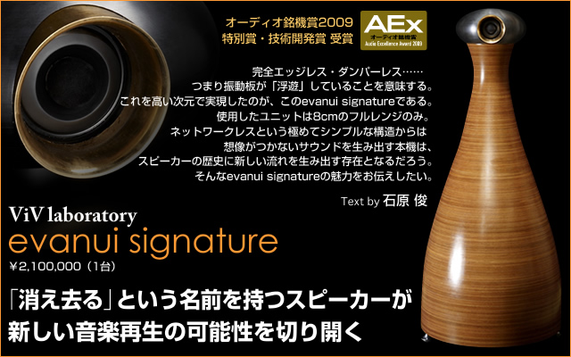 天才的スピーカーが登場した。夢のスピーカーといってもいい。なにしろこのモデルのドライバーユニットにはダンパーもエッジもなく、振動板は(理論的に)空中に浮遊した状態で存在しているのである。しかもドライバーはほぼ点音源的に動作し、共鳴という、いわばスピーカーの現実的必要悪を持たない。開発者の名は秋元浩一郎。彼はスピーカーのジェームズ・バロー・ランシングや、アンプのマーク・レビンソンに匹敵する天才ではないかと筆者は密かに思っている。 evanuiという名称は、ラテン語系で「消え去る」という意味の語幹をとったものであろう。たとえばフランス語には「evanouir」という動詞があって、「見えなくなる」とか「消え去る」という意味に使われるのだが、「気を失う、気絶する」という訳語もあって、まさにこのスピーカーと対面した時は気を失いそうになるほど驚いた。 |