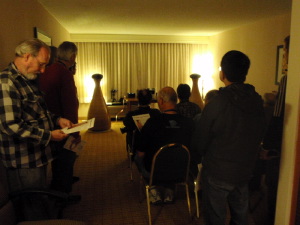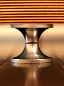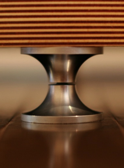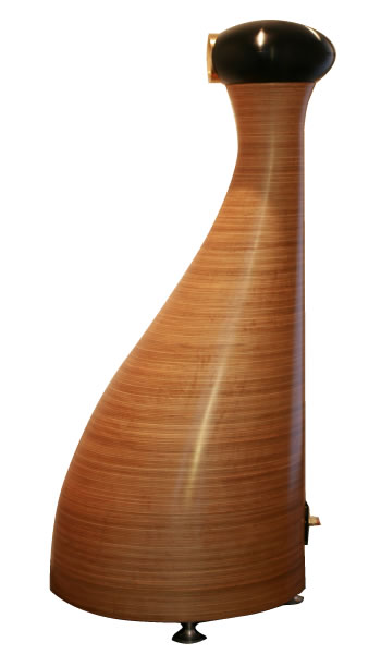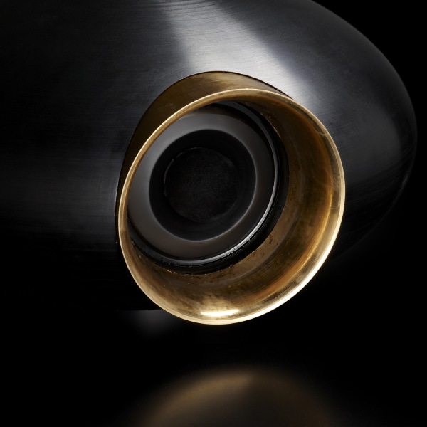 ヘッドの下にある巨大な壺状の物体はバックロードホーンだ。ヘッドの下側にはバックプレッシャーを逃がすポートが開いており、ユニットの後方から発せられた波動が下向きに放射される。壺の内部の形状は理想的なエクスポネンシャルホーンに近似したものだ。これは18mm厚のシナアピアトン材を63層にも積み重ねたもので、まさに壺のような形状をしているのだが、壺は壺でもどこかの古代文明の遺跡から発掘されたような印象を受ける。一見しただけではスピーカーと思えない。 しかし、箱型のスピーカーデザインというやつはビクトリア朝の家具から想を得たもので、つまらないといえばこれ以上つまらないデザインはないのである。その点、古代からやってきたような本機のデザインは見る者の心を強く揺さぶる。話はちょっと逸れたが、この壺を床に直置きするとホーンロードのかかった音が出なくなるから、底面はスパイク(R型なので床を傷つけない)を介してセッティングする。