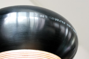 本機の内容をざっと見ていこう。発音体は漆塗りの純マグネシウムを素材とする8cmの振動板で、大型ネオジウム磁石を用いた純鉄磁気回路を搭載している。この発音体が直径30cmの鏡餅型のヘッド(重量は20kg!)にマウントされている。振動板を保持するのは、特殊な液体で、シール、ダンプ、潤滑の役割を果たしている。これによってヘッド部に固定された振動板が「浮遊」している状態が保たれているのである。