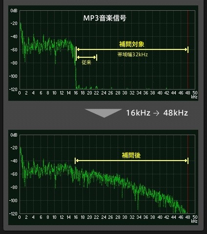 高域補間のイメージ。上のMP3信号では16kHz以上のデータがすっぱり切り落とされているが、補間後は48kHz程度まで伸びている |