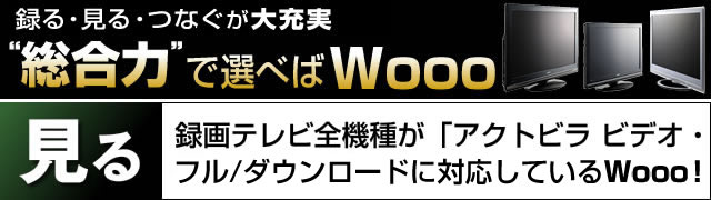 Woooは、高画質の映像配信サービス「アクトビラ ビデオ・フル/ダウンロード」に対応。「TSUTAYA TV」が配信する全5,000タイトル以上の中からダウンロード対応コンテンツを、いつでもWoooの内蔵HDDにダウンロードして視聴できる。2009年に発売されたすべての録画テレビがこのサービスに対応していることからも、Woooが際立った先進性を備えていることがわかる。