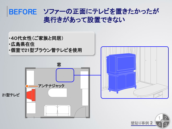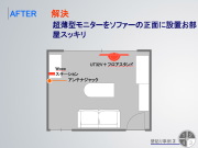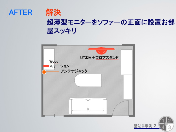 UTシリーズの設置事例。奥行きのあるブラウン管テレビは設置場所が限られてしまっていたが、わずか3.5cmという超薄型モニターと、ワイヤレスでも使用可能なチューナー部により、これまででは実現できなかったレイアウトを可能にする |