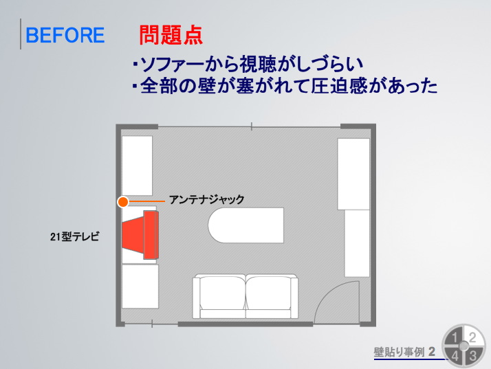 例えばドアや窓の配置により、テレビに対して正面にソファーなどを置けない家は少なくないだろう。ガラス面の多い家だと、出入りや採光の邪魔にならないように、部屋の隅にテレビを設置しがちだ。