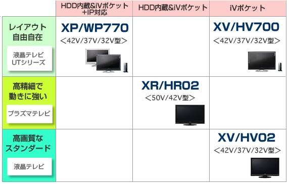 録画機能に優れるのがUTのXP770/WP770シリーズ、プラズマXR02/HR02シリーズだ。これらはダブルデジタルチューナーを搭載するので裏番組録画も可能。本体内に250GBのHDDを搭載し、さらに着脱可能なカセットHDD「iVDR-S」用のiVポケットを搭載している。ほかに、UTのXV/HV700シリーズ、また液晶テレビのXV/HV02シリーズはHDDを内蔵せず、別途「iVDR-S」を挿入することで録画機能が利用できる。