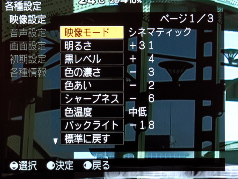 | 「スーパー」「スタンダード」「リビング」「シネマティック」の4つの映像モードを用意。各視聴環境やソースによって最適なモードを選べるほか、コントラストや黒補正などを細かく設定することも可能だ |