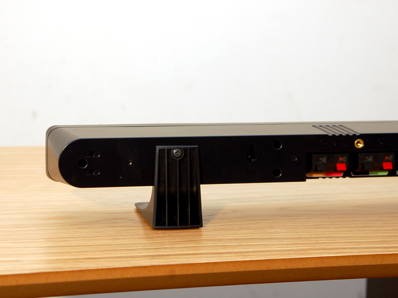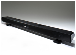 | YHT-S400のスピーカー部は、左右2chのステレオスピーカーと中央にセンタースピーカーを配置した3ch構成。幅8cmのスリムサイズでテレビの前に置ける手軽さが魅力だ |