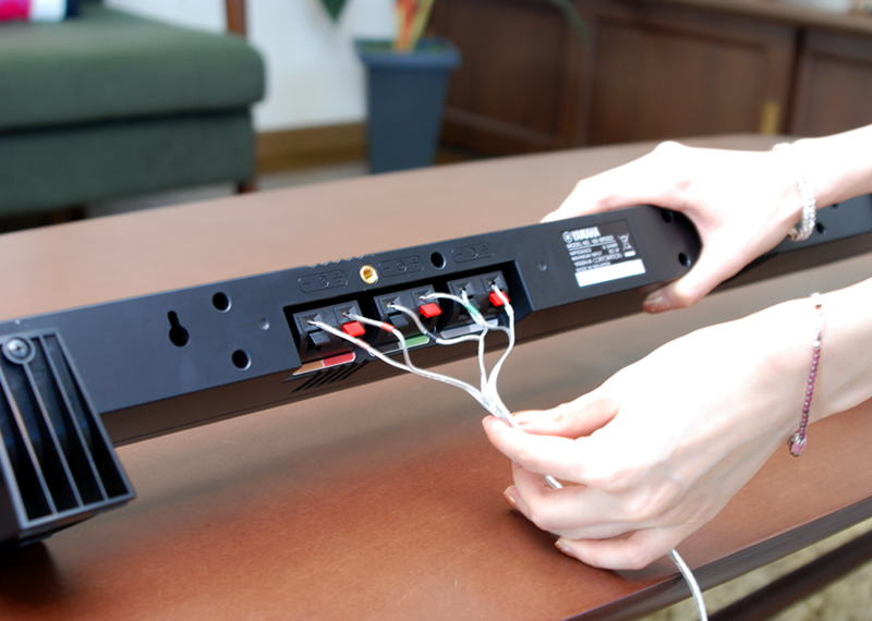 | センターユニットが一体型のため、スピーカーとユニット間は付属のスピーカーケーブルで同じ色の場所に接続するだけ。普通のシステムをAV機器に疎い人が使用する、このスピーカーとの接続の時点でどこにどの線を繋げばいいのかわからなくて混乱してしまうことが多い |