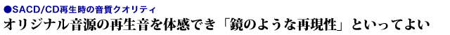 そして、CDも一通り聴いたが、驚くべきことにSACDとほとんど音質傾向の違いがない。滑らかさや余韻の美しさは明らかにSACDへ軍配があがるが、CDでも「鏡のような」再現性はまったく減ずることがない。まったく素晴らしいシステムである。 |