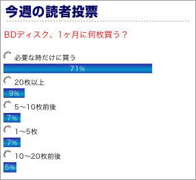 ますます録画・再生の画質、その他の機能も充実してきたBDレコーダー。昨年の同時期にも「1ヶ月に使うBDディスクの枚数」に関する読者アンケートを行ったが、今回は当時の比較も含めて最新の投票結果をご紹介しよう。