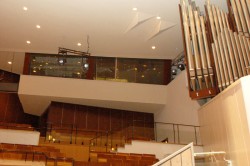 カメラの操作は舞台上手側上方、パイプオルガン脇のコントロールルームで行う。この部屋は調整室と機械室に分かれており、後者には大容量のサーバーなど中継用の機材がぎっしり並んでいる。従来なら録音用機材が並ぶスペースだが、いまはその代わりにネットワーク関連機器がインストールされているわけで、時代の変遷を感じる。