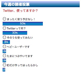 その一方、「まったく使う予定なし!」と言う方が圧倒的に多く、半数を占める結果に。ネット界は“猫も杓子もツイッター”という状況ですが、大勢に流されない潔ささえ感じられます。