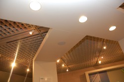 スピーカーはダウンライトと並べて設置されているのですが、一見では見分けがつかないほど溶け込んでいます。それも一般的なダウンライトとマッチするデザインを採用しているから。ちなみにスピーカーはペインタブル対応で壁紙に合わせた色に塗装することもできるそう。