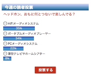 投票の結果は、お手持ちのヘッドホンを「HiFi環境で楽しむ」という声、「ポータブルオーディオプレーヤーで聴く」という声がちょうど35%前後で並びました。この数年でヘッドホンのリスニングスタイルは、従来のハイエンドオーディオ+オーバーヘッド型ヘッドホンというスタイルからポータブルオーディオへ広がり、その上、ポータブルオーディオプレーヤーの付属ヘッドホンを交換して、よりグレードの高い音、自分の好みに合う音を楽しむスタイルへ展開してきました。この間、リスニング時の音漏れや、外部音の飛び込みが避けられるメリットから、耳栓タイプのカナルイヤホンが一気にブレイクしました。