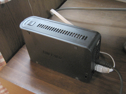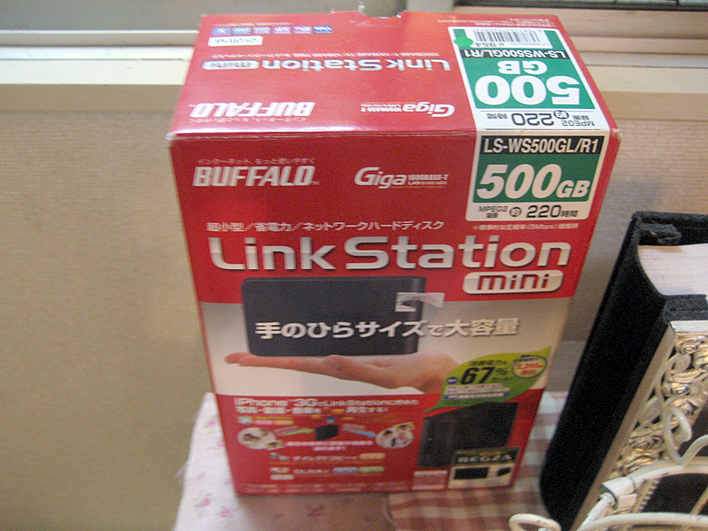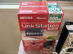| DS導入の準備段階として、バッファローのリンクステーションミニLS-WS500GL/R1を購入。オープン価格だが、実勢2万5000円ほどだった(2009年末) | NASはデータを貯める倉庫である。このモデルは手のひらサイズでとてもかわいい |