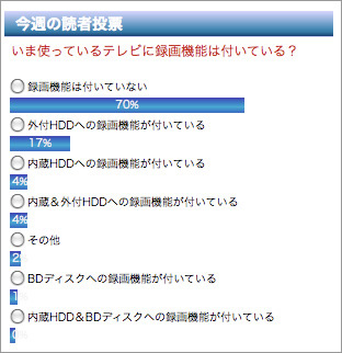 本体に録画機能を搭載したテレビの人気が伸張しているという。録画機能搭載テレビを販売している某社のデータによれば、2010年にはデジタルテレビの国内需要における約20パーセントを録画機能付きテレビが占めるという予測もある。今回はPhile-webの読者に、録画機能付きテレビの導入状況を訊ねてみた。