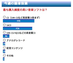 結果は「CD(SHM-CDなど高音質CD含まず)」が44パーセントでトップ。やはり絶対数が圧倒的に多いだけに、納得の結果といったところだろうか。