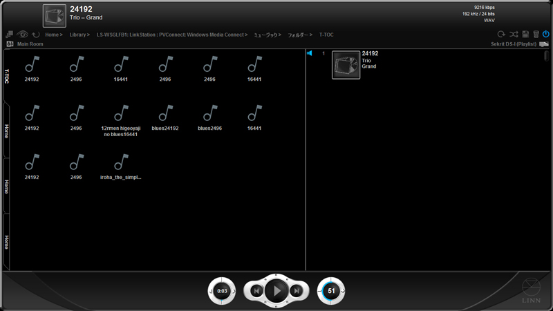 DSはリニアPCMの最高スペックである192kHz/24bitまで対応しているところが頼もしい。ハイスペック音源がそのスペックどおりで出てくるので、プレイリストに入れておいて再生ボタンを押しておけば、あとはソファで座って聴けばよいのだ。