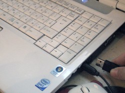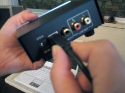 今回はラトックのUSB DAC RAL-24192UT1という新製品を使わせてもらう。USBケーブルと、パソコンにドライバーをインストールするためのCD-ROM付き(まだ試作機だったのでディスクは白盤のCD-Rだ)。このドライバーは本機が192kHz/24bitまで再生できるUSB Audio Class 2.0に対応しているために必要となるもので、一般的な96kHz/24bitまでに対応したUSB DACではドライバーなしで動作するものがほとんど。また、MAC OS 10.6以降ではドライバーは必要としないものがほとんどなのだという。 | USBオーディオは、パソコンから出力する音をUSBケーブルを使って外に出力するだけのもの。接続はUSBケーブルを使ってパソコンとDACをつなぐだけである。 |