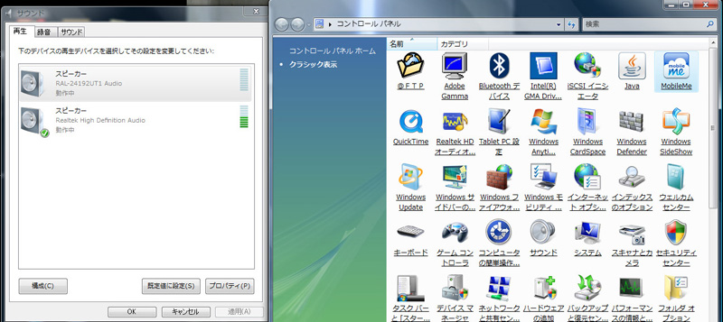付属のドライバーをインストールしておく。再生ソフトは自分で用意する。私はフリーソフトMediaMonkeyをネットからダウンロードして使用。 | パソコンの出力設定はパソコン内蔵のスピーカーではなく、接続したDACに合わせておく。Windows Vistaまたは7なら「コントロールパネル」→「サウンド」の欄を開くと、接続しているDAC名が出てくるので、そこをクリック→OK。MAC OS Xの場合はデスクトップ画面のDOCK(もしくは画面左上のアップルメニュー)から「システム環境設定」→「サウンド」で「出力」タブをクリック→「サウンドを出力する装置の設定」。聴きたい音源をプレイすると、DAC接続しているスピーカーから音が出てきた。 |