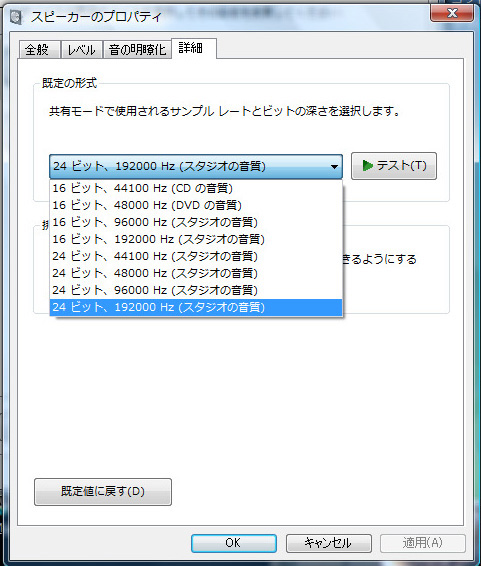 Windows Vistaまたは7の場合「コントロールパネル」→「サウンド」→接続したDACの名前→「詳細」を選び「44.1kHz/16bit〜192kHz/24bit」のいずれかで出力するかを設定。また、「サポートされている形式」タブからサンプルレートにチェックを入れておく。MAC OS Xの場合は「Macintosh HD」→「アプリケーション」→「ユーティリティ」内にある「Audio MIDI設定」の「オーディオ装置」にて、出力のフォーマット設定を行う。 |