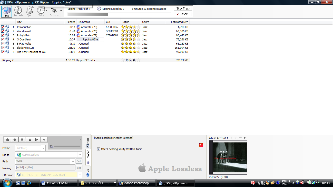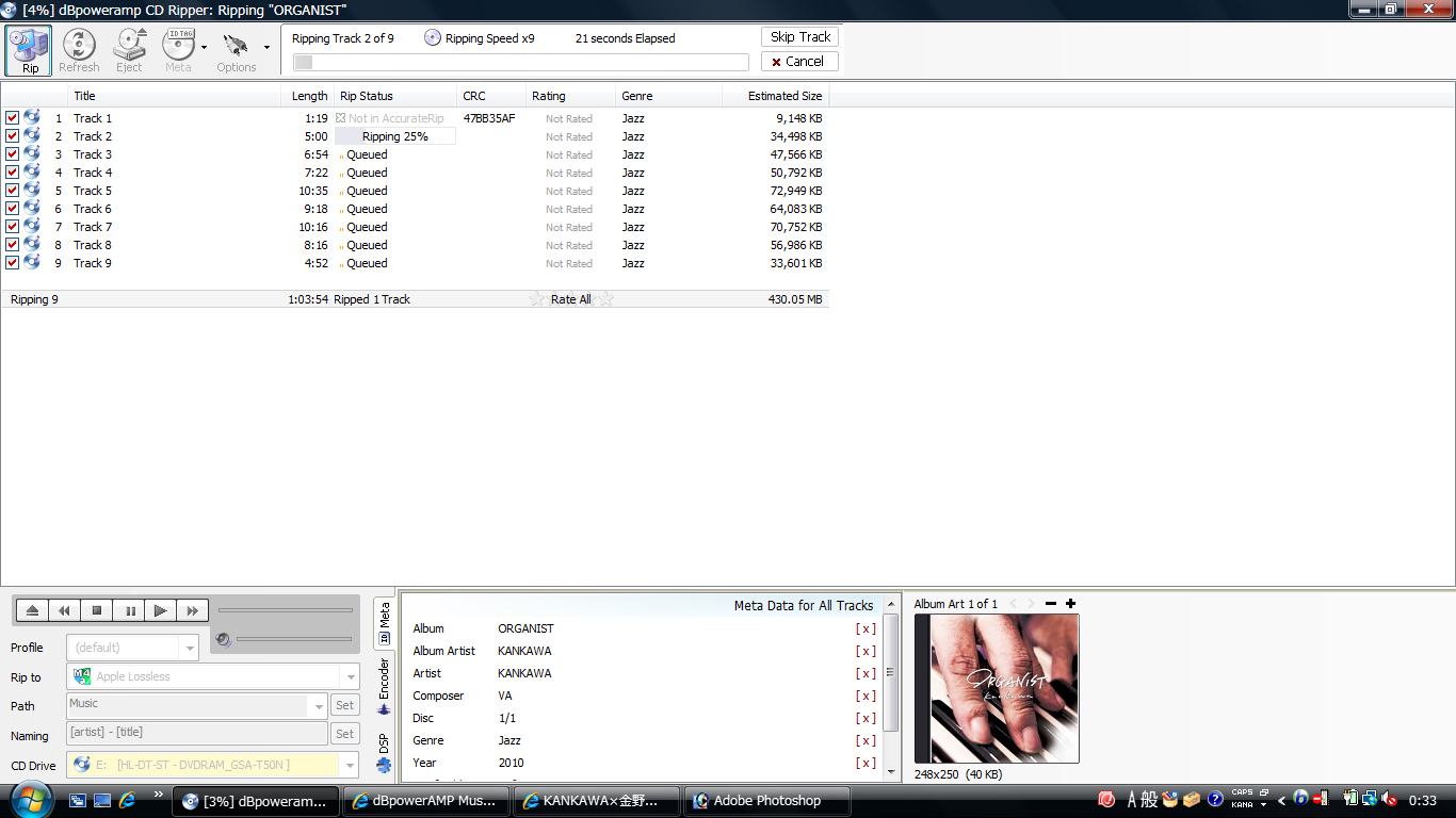 タグ情報を付けてリッピングをし始めると、dB powerampの画面の中の「Rip status」の_に「Riping 25%」などパーセンテージが現れて、100%に達すると次のトラックへと進んでいく。そのさまは意気揚々と気持ちの良いものであるが、100%に達した途端「Not in AccurateRip」とか「Accrate(77)」という表示が出てきた。