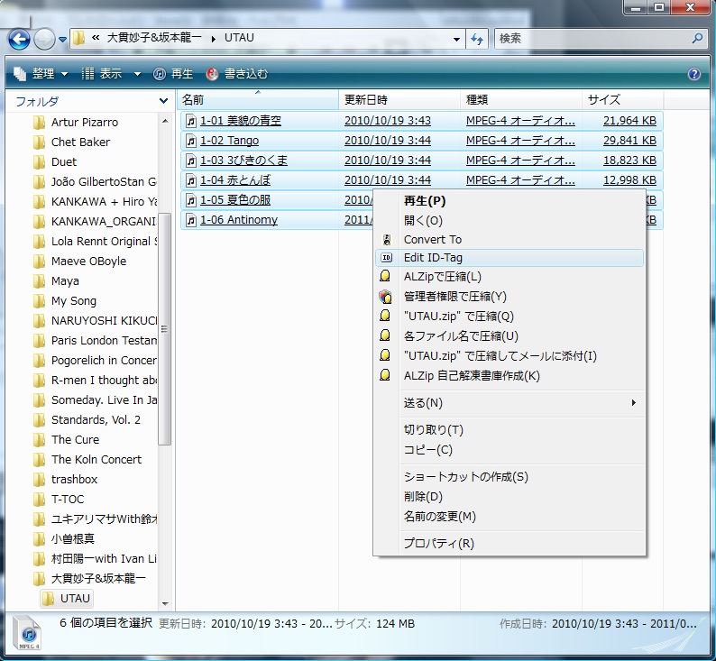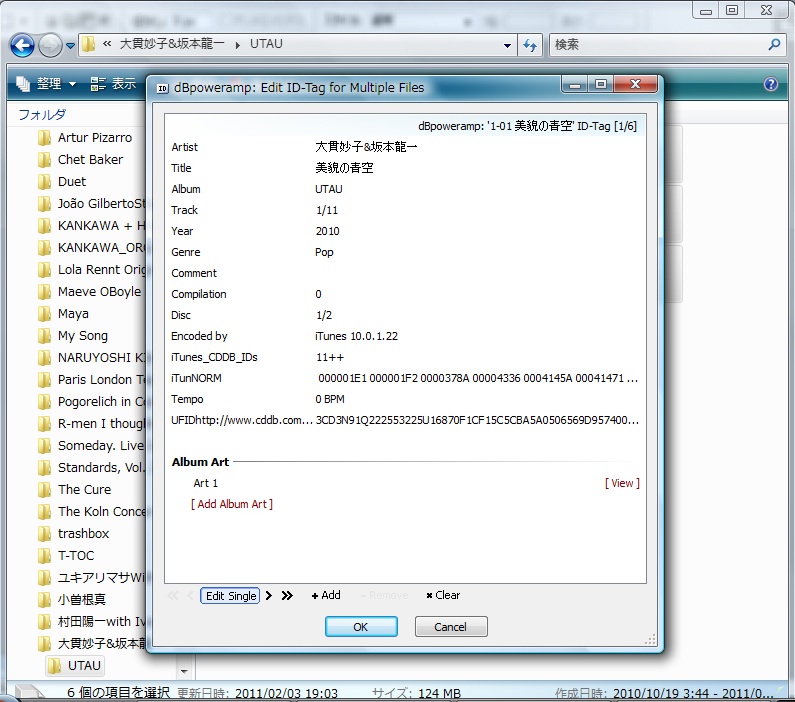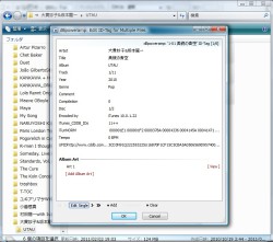 ミュージックファイルを右クリックし「Edit ID Tag」から簡単にタグ情報が直せる。リッピング時に入力した情報から変更、追加、削除など自在にできる。複数のミュージックファイルを一括して直したい場合は、画像のようにシフトキーで一括して右クリックし「Edit ID Tag」を。 | リッピングの時にアルバムアートをつけられなかったものもあるだろう。画像を付加したい複数のファイルをシフトキーで一括し、右クリックで「Edit ID Tag」→「Edit Single」→「Add Album Art」で画像ファイルを付加→「OK」 |