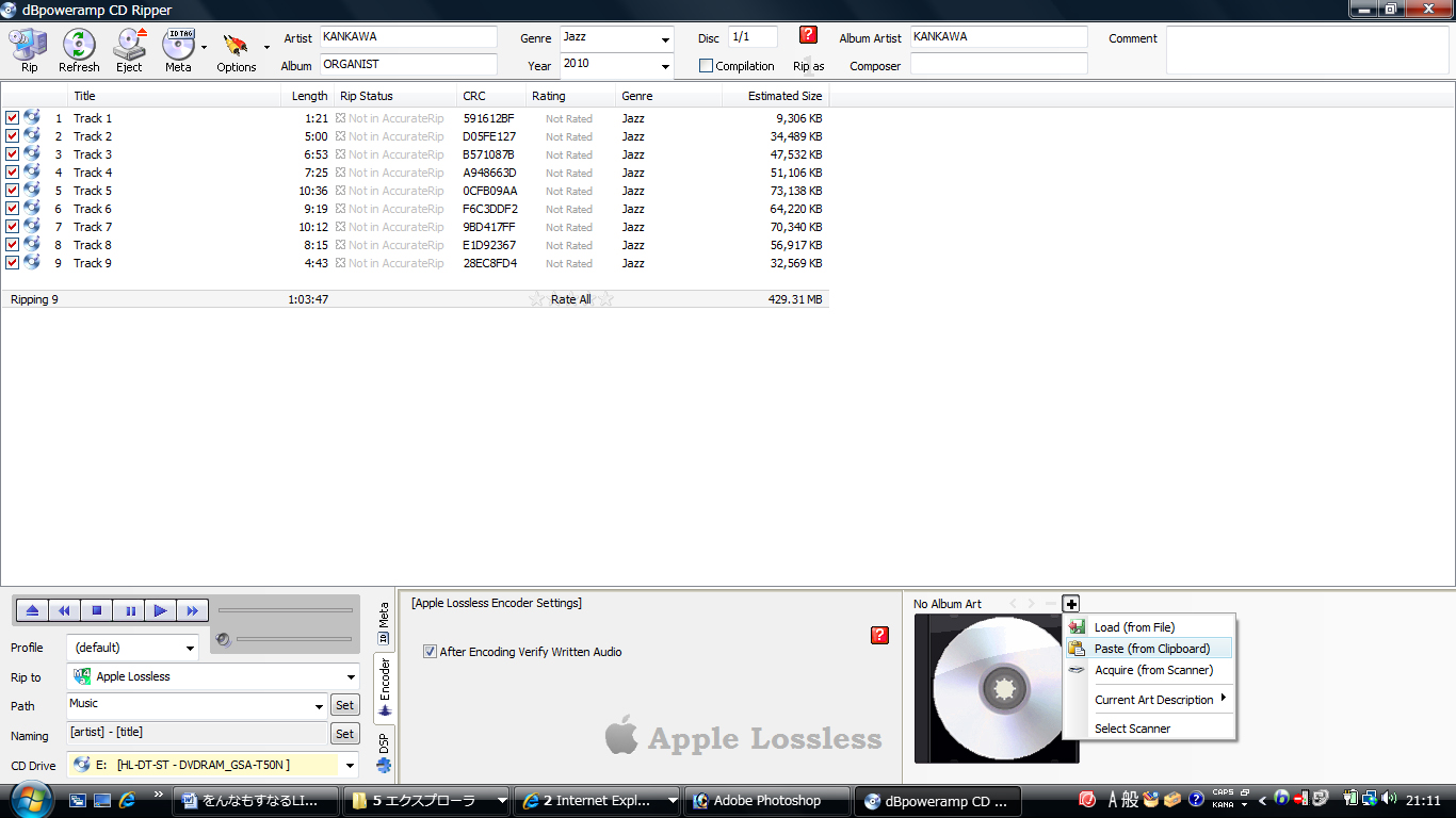Rip Satus_の「Not in AccurateRip」→「正確なリッピング・データベースのなかに、こちらのデータは見つかりません」、つまり、いまあなたがリッピングしたものが初めてのものです、という意味 | Rip Satus_の「Acculate(77)」→「データベースのなかに限りなく近いデータが77個ありました」。ちなみにこのタイトルは、リッピングソフトがメタデータを拾ってきてくれて、私が何も入力しなくても曲名もアルバムアートもすべて自動的に付いてきた |