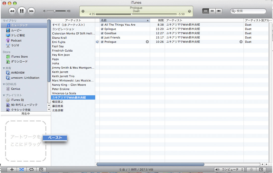 なお、これらの機能は、iTunesなどでも可能。iTunesに後々アルバムアートを貼り付けたい場合は、「ここにアートワークをドラッグ」という欄に画像をドラッグして貼り付けるか、コピー&ペーストすれば可能 | アルバムアートが入った。iTunesは再生ソフトでもあるため、後付けも非常に便利にできている |