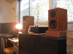SEKRIT DS-Iとスピーカーの置き場は、昨年秋に友達から譲ってもらった古い洋棚に変更。以前置き台にしていた和ダンスは桐製で、安定はしていたけれど、素材として軽いので音的に少し不安だった。今回は硬い素材なので、前より良い音がしている気がする |