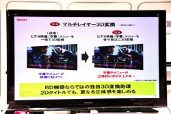 2D-3D変換の進化では「マルチレイヤー3D変換」が新しい。市販BDソフトを視聴する際、ビデオと字幕、メニューをそれぞれ独立して3D変換することで、字幕やメニューを立体的に表現することが可能になった。マルチレイヤー3D変換は、ビデオや字幕、メニューを一つの映像として合成する前に3D変換処理を行える、BD再生機器ならではの機能と言える。通常のテレビでは、映像はメニューや字幕などの情報が分離されずに入力されるため、このような処理は不可能だ。