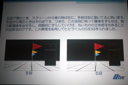 こちらの3本の旗の絵。左目側の映像では、スクリーンから奥の物は左に、手前は右にずれているのが分かる。右目の場合はその逆となる。「ヒピラくん」の3D映像も、もちろんこの原理を応用して作られている。