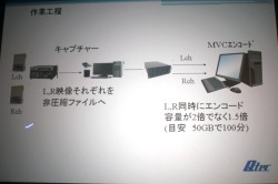 Blu-ray 3Dでは、MVCエンコーダーとMVCストリームに対応したTS多重化処理を行う必要がある。まずは左/右映像をそれぞれ非圧縮ファイルとして取り込み、左/右を同時にMVCエンコードする。通常左chのデータをベースにし(Base View)、右chはDepending Dataとして差分のみ扱うため、エンコードする容量は2倍ではなく1.5倍程度になる。映像の長さにもよるが、MVCエンコードはだいたい50GBあたり100分ほどの時間がかかるという。