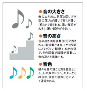 音の大きさと高さが同じでも、わたしたちはバイオリンとピアノの音を聴き分けることができる。これは音色が異なるためだ。自然に存在する音は、振動数の最も小さい基音と複数の倍音から構成される複合音であるが、音源によってその複合の仕方が異なる。その違いを音色の違いとして捉える。音の大きさや高さは一つに限定できるが、音色は無限に存在する。