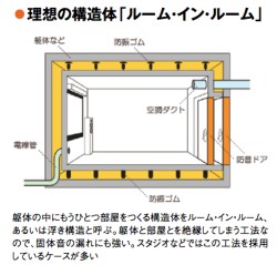 究極の遮音といえば、スタジオなどで採用されているのが浮き構造だ。ルーム・イン・ルームとも呼ばれ、躯体の中に防振ゴムなどを用いて振動を絶縁した遮音層を設けて、その中にもうひとつの部屋をつくる。要するに部屋の中に部屋をつくり、その中間に振動を伝わらないように空気層と防振支持を設けるというものだ。この手法で重要なのは、穴や隙間を徹底的にふさぐことだ。音は開口部から漏れる。空調設備、照明、コンセント、埋め込みスピーカーなど、多数の開口部をふさいだり、特殊な部材を用いる必要がある。そのため、日東紡音響エンジニアリングのような防音のプロフェッショナルにゆだねるべきだ。