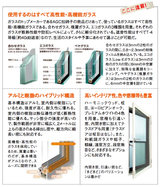 「まどまど」はガラスの種類が非常に豊富で、ガラスの間に特殊フィルムを挟み込んだ合わせガラスをはじめ、複層ガラス、エコガラスが用意され、さらにそれぞれが断熱性能や防犯レベルによって複数ラインアップされている。たとえば最近の節電や省エネを受けて選ぶならば、特殊金属膜をコーティングした遮熱・断熱効果を高めたエコガラスがお薦めである。冷暖房負荷を軽減し、年間を通して快適性、省エネ性が向上する。ライフスタイルにあわせてガラスを選ぶことができる。
