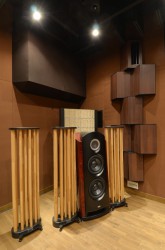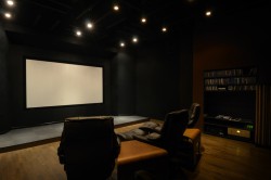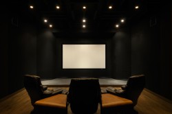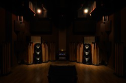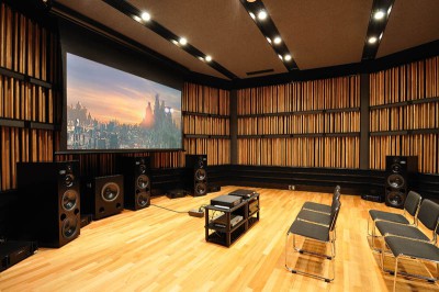 ホームシアターに関しては、スピーカーはサランネットの裏に隠し、暗闇の中にただ映像のみが浮かび上がるスタイルとなっている。ホームシアター側は吸音を優先させ、ややデッド気味に設えた。オーディオ側は逆に拡散を優先させ、音の響きを活かすスタイルとなっている。TAD-Reference Oneの周囲には、壁のない理想的な音場と言われている森の音響効果を室内で実現するSylvanを設置し、音の広がりを重視した。