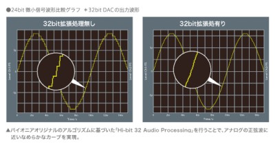 「Hi-bit 32 Audio Processing(Hi-bit 32)」とは、16bitや24bitの音声を32bitに拡張して処理することに加え、32bitへハイサンプリング処理も行うことで、再生帯域の拡張を同時に行える機能。信号がよりアナログの正弦波に近くなり、細かな音のニュアンスまで再現できるようになるというものです。ネットワークプレーヤー機能使用時はもちろん、後述するUSB-DAC機能使用時にも利用可能です(Hi-bit 32の効果のほどについては山之内 正氏のレビューをぜひご参照ください)。