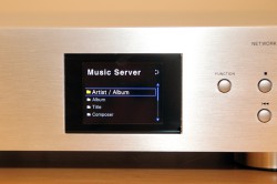 N-50のネットワーク設定が完了したら、リモコンの「MUSIC SERVER」ボタンを押すと、ネットワーク内にある機器が表示されます。LANケーブルでつないだPCやNASが見つかったら、それを選択。聴きたい音源の入ったフォルダを選んで、目当ての曲を見つけます。