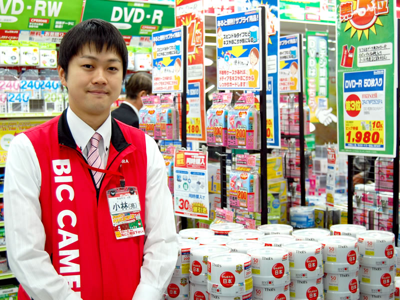 「同社の売上げの一部が義援金に充てられるということで、そのことを理由に『がんばろう!日本』を選ばれるお客様もいらっしゃいます。東日本大震災で被災された方に対し、自分でできることを何かやりたい。そういう思いをカタチにできる商品だと思います。お客様からのお問い合わせもいただいています」と語る小林氏。  | | ビックカメラ有楽町店 4階 サプライコーナー 小林亮介氏 |